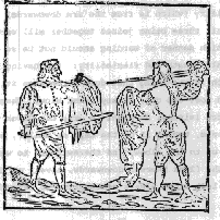 It is most manifest that both these weapons may strike in one and the same time: for there may be delivered jointly together two downright edgeblows on high and two beneath: two reverses, and two thrusts, and are so rich and plentiful in striking, that it seems they may be used only to strike. But this ought not to be practiced, neither may it without great danger For all that, whatsoever may be done with either of them, is divided into striking and defending. That this is true, it may be perceived in the single Sword, which assays both to strike and defend. And those who have taken no such heed, but have been bent only to strike being moved either through cholera, either believing, that they had to deal with an ignorant person, have remained thereby mightily wounded. of this, there might be laid down infinite examples, which I leave to the intent I may not swerve from my purpose. I say therefore that of the two Rapiers which are handled, the one must be applied towards the other to strike, regarding always to use that first which wards, then that which strikes: for first a man must endeavor to defend himself, and then to strike others. (Figure 15)